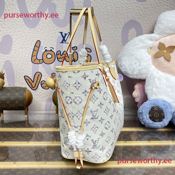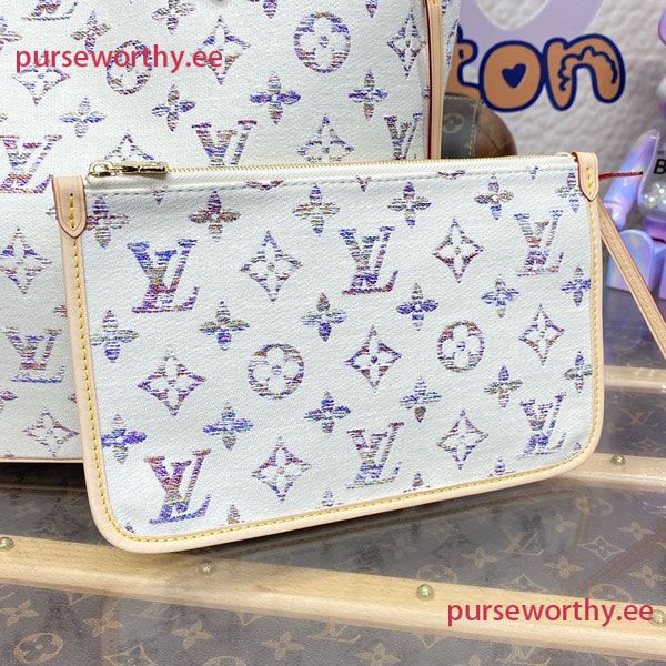 This spacious Neverfull MM is part of the Nautical capsule and features multicolored LVs and Monogram Blossoms. Sixty-six multicolored threads, in a subtle gradient of colors, are woven together to create the jacquard motif. Connected to the long shoulder straps is an engraved mirror charm. Inside, there’s a matching removable zipped pocket.