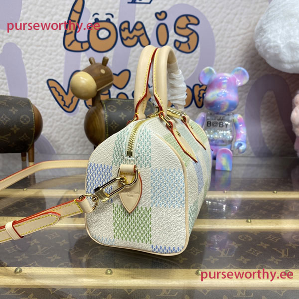 This Speedy Bandoulière 20 handbag is made from Damier Giant canvas in a fresh colorway that combines four different pastel shades, thanks to a precise digital printing technique. Inspired by the House’s classic travel bag, the distinctive shape has two rolled-leather top handles and a detachable and adjustable strap for shoulder and cross-body wear.