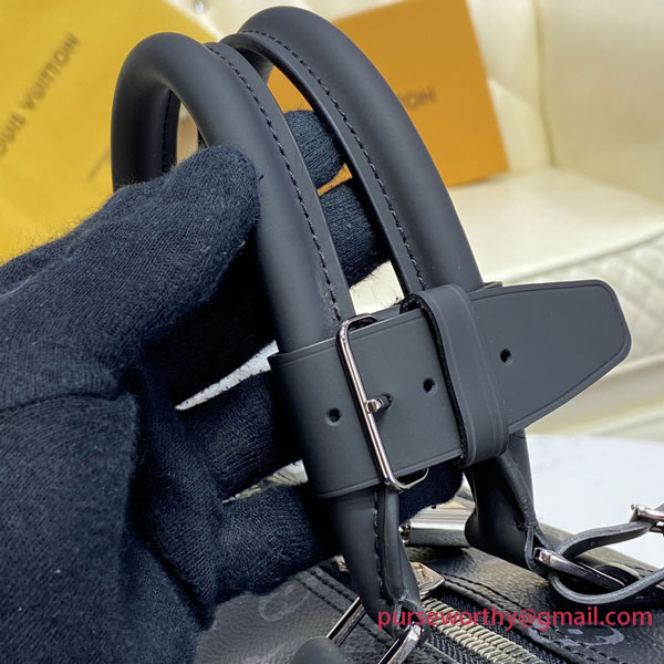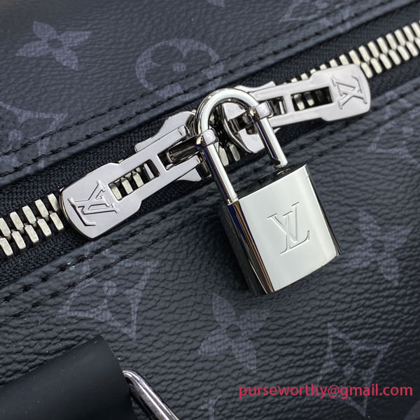 This iconic Keepall 45 Bandoulière is fashioned in our new iconic black and grey Monogram Eclipse canvas. Since 1930, the Keepall duffle has journeyed alongside generations of elegant globetrotters. This version – with comfortable-to-hold leather handles, a strap for casual cross-body wear and a gleaming padlock – holds all the essentials for an overnight jaunt.