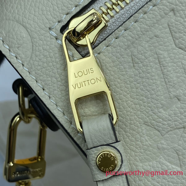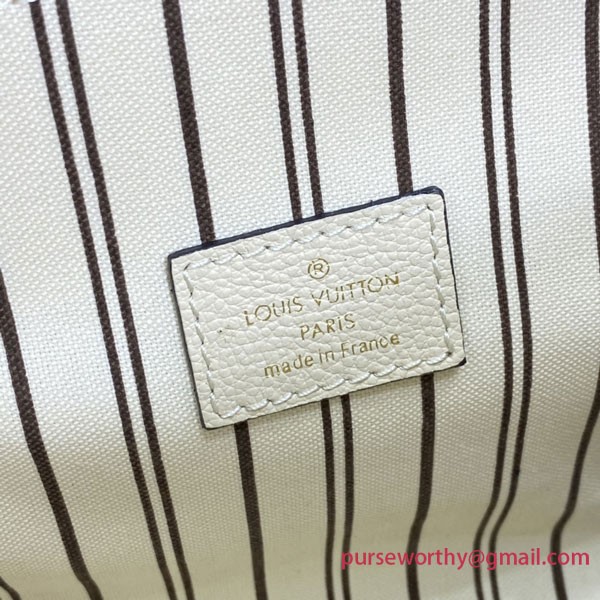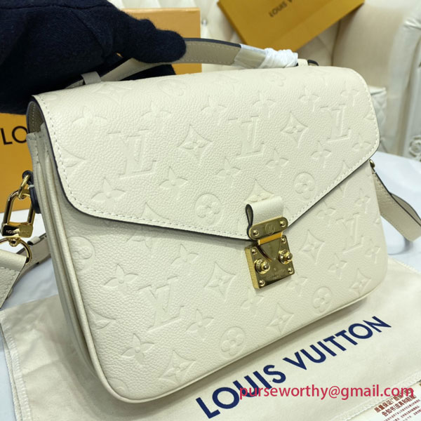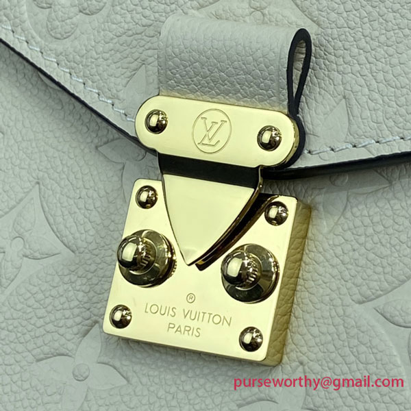 The Pochette Métis handbag, with its classic satchel silhouette, looks luminous in cream-color Monogram Empreinte leather with a matching microfiber lining. The discreet Monogram pattern embossed into the leather and the gold-color hardware, including the S-lock closure, give a modern elegance to this distinctive bag