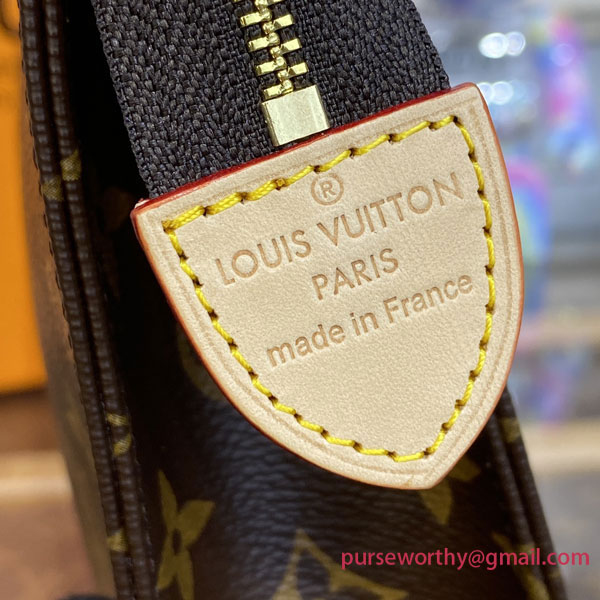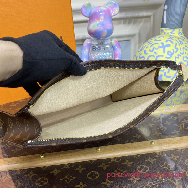 The largest of the toiletry pouch in Monogram canvas boasts a spacious interior with gusset sides for easy storage. It slips easily into a handbag.