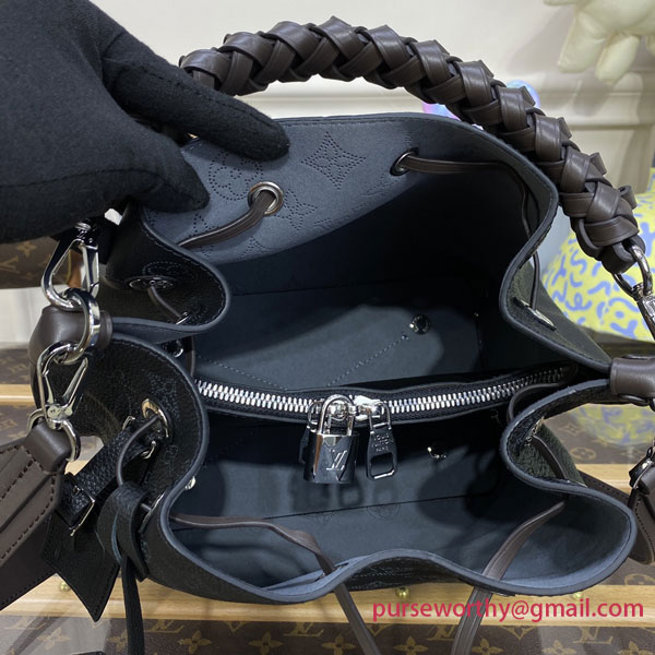 The Muria bucket bag is made from Mahina calf, a perforated leather with a discreet Monogram motif. Supple and sophisticated, it is a pleasure to carry, either by the braided top handle or the long leather strap, which adjusts for short- and long-shoulder or hands-free cross-body wear. Crafted signature details include a name tag and keybell in smooth calfskin.