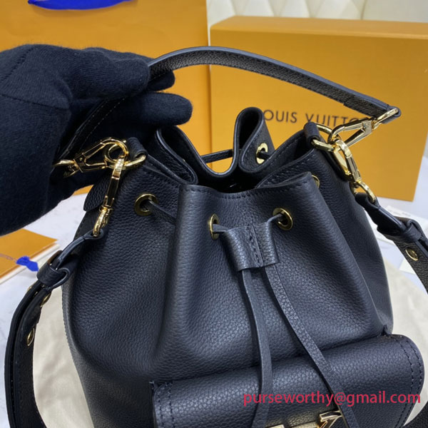 The Lockme Bucket bag in grained calf lather is immediately recognizable by its faceted LV turn lock on the front pocket. This supple bag with curvy proportions is comfortable to carry. The removable and adjustable strap in leather means it can be worn on the shoulder and cross-body, while a removable top handle enables hand and elbow carry.