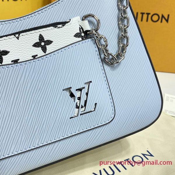 The trendy Marelle is fashioned from grained Epi leather, endowed with a detachable canvas pouch attached to the bag thanks to a silver chain. This subtle touch of Monogram is visible thanks to the LV see-thought crafted in the front pocket of the bag. The Marelle can be carried by hand, elbow or shoulder with its detachable top handle, or worn as a cross-body thanks to its removable and adjustable leather strap.