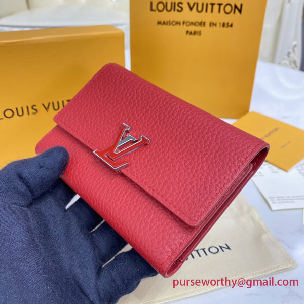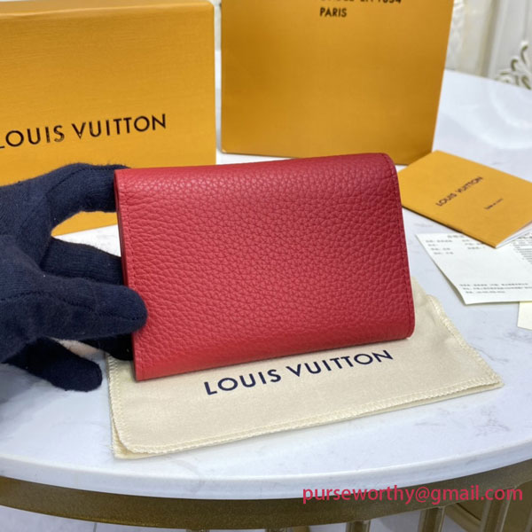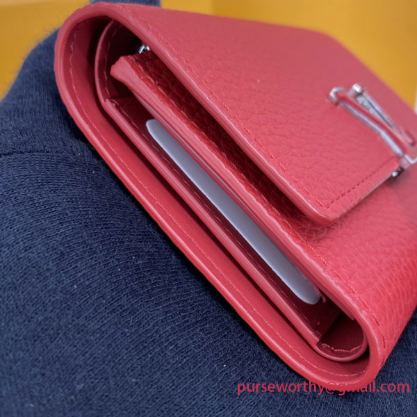 Crafted in supple Taurillon leather, the Capucines Compact Wallet has many functionalities and a large capacity to fit every day essentials. The ingenious and original structure of this elegant pocket-sized wallet made of 2 fold-over flaps gives you ample space for credit cards, coins and bills.
