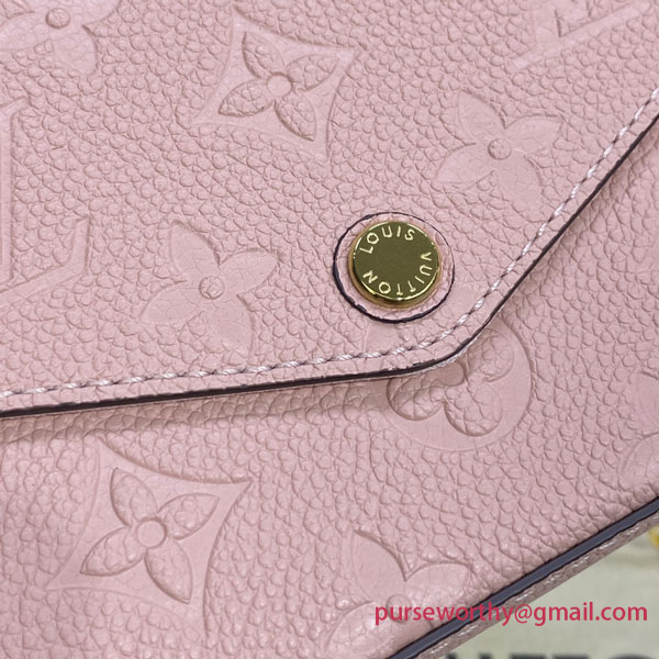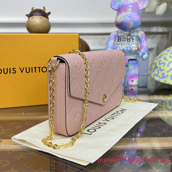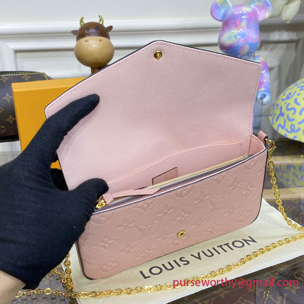 The Pochette Félicie in Monogram Empreinte leather is embossed with Louis Vuitton's emblematic Monogram pattern. The envelope-style design features two removable inside pockets and a removable gold-color chain, and can be worn on the shoulder or hand-carried as a clutch.