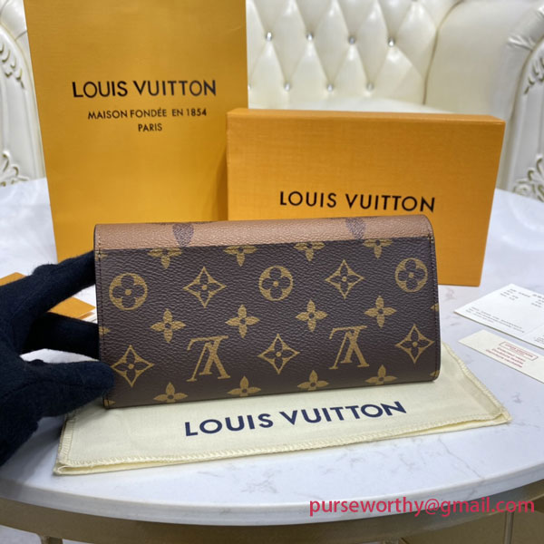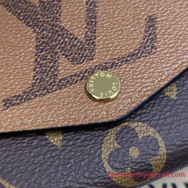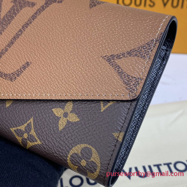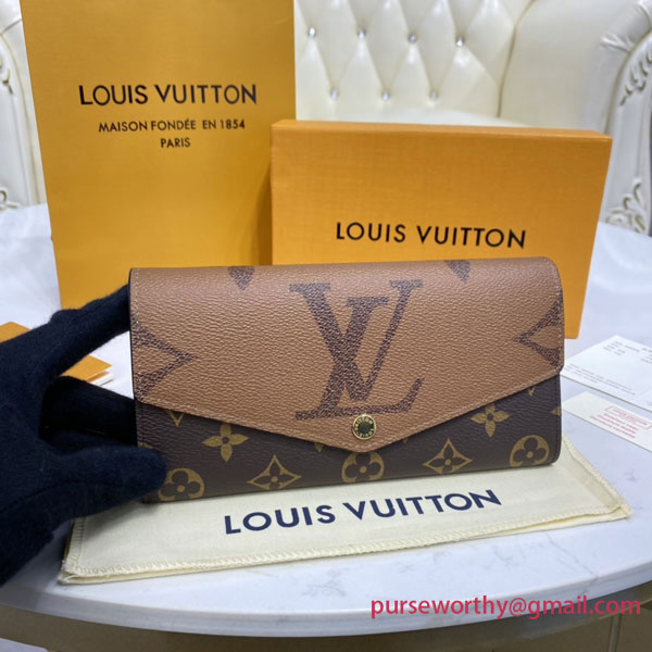 The Sarah wallet is revisited in an elegant combination of Monogram and Monogram Reverse Giant canvas. This classic, rectangular wallet is notable for its well-organized interior featuring an array of pockets and card slots. Its envelope-style flap is secured with an engraved, gold-tone press-stud.