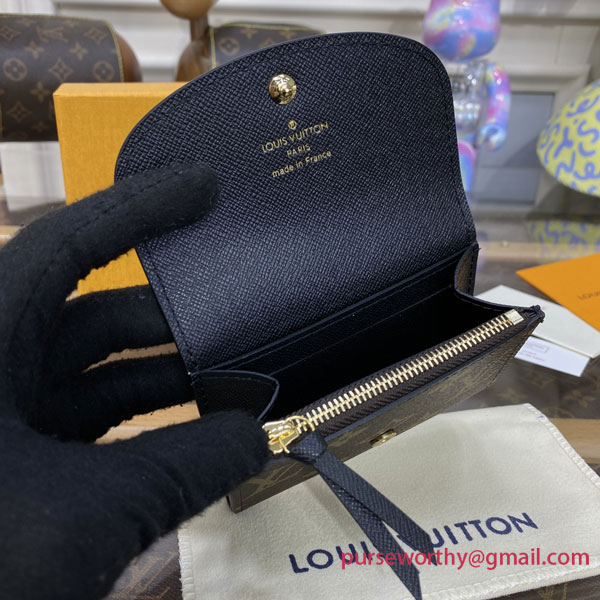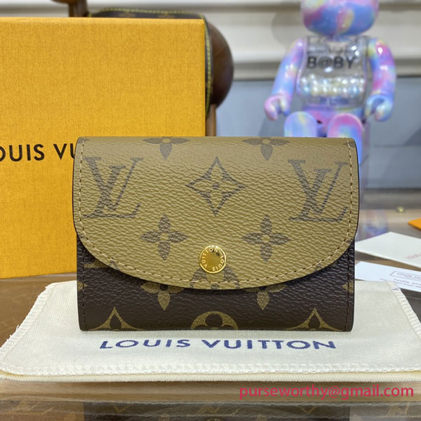 The Rosalie coin purse combines Monogram and Monogram Reverse canvas for a refined signature look. This tiny purse is distinguished by its rounded flap, which is secured with an engraved, gold-tone press-stud. Inside, it offers a flat pocket, a zipped pocket for coins and two card slots, while there is an additional flat pocket at the back.