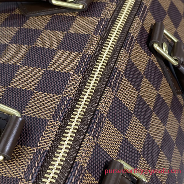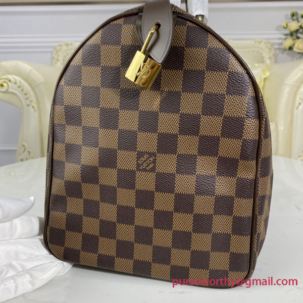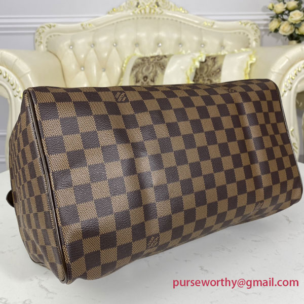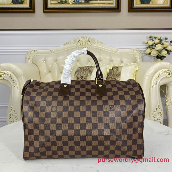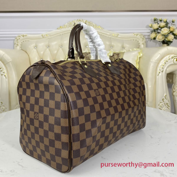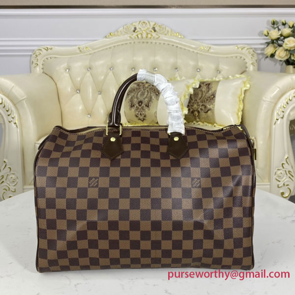 Made from elegant Damier Ebene canvas, the Speedy 35 is a stylish handbag for both travel and daily use. Launched in 1930 as the "Express" and inspired by that era's rapid transit, today’s updated Speedy remains a timeless House icon, with its unmistakable silhouette, rolled leather handles and engraved, signature padlock.