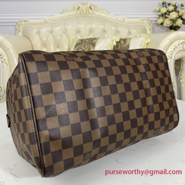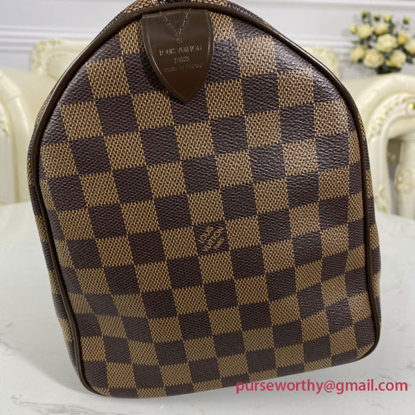 Crafted from graphic Damier Ebene canvas, the Speedy 30 is an elegant, compact handbag, a stylish companion for city life. Launched in 1930 as the "Express" and inspired by that era's rapid transit, today’s updated Speedy remains a timeless House icon, with its unmistakable silhouette, rolled leather handles and engraved, signature padlock.