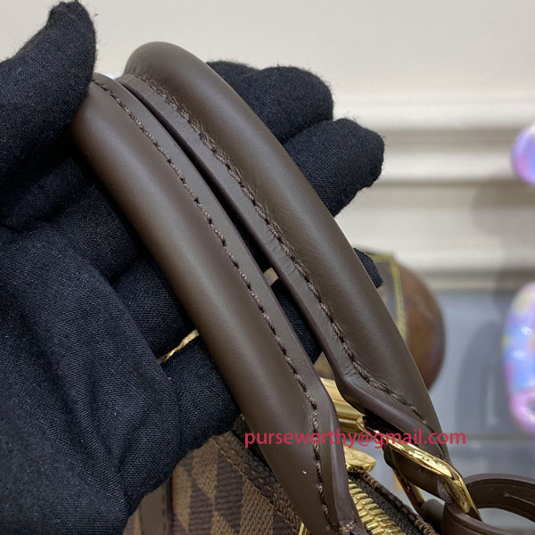 A timeless House icon, the Alma PM handbag is perfect for every day. Its structured lines recall the Art Deco original, designed in 1934 and named for the Alma Bridge in Paris. Crafted from signature Damier Ebene canvas, with hand-stitched Toron handles, natural cowhide trim and gleaming golden hardware, this elegant model can be carried by hand or on the elbow.