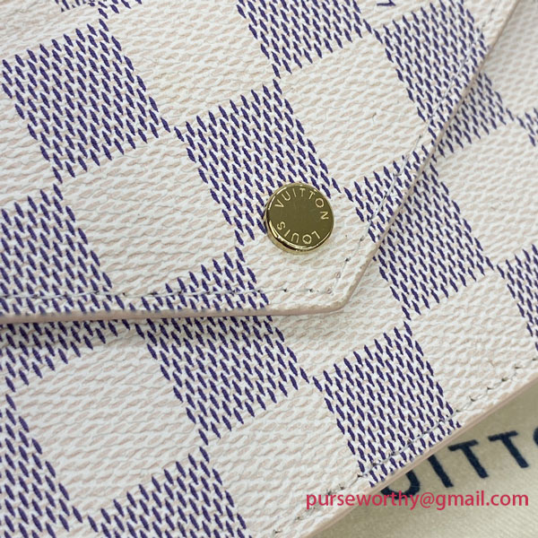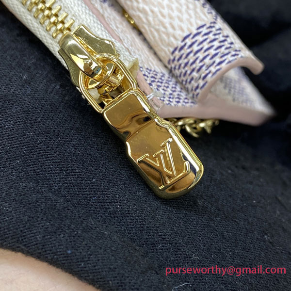 Crafted from Damier Azur canvas with colored leather trim, the Card Holder Recto Verso is an ingenious, multi-functional accessory, which can be hooked onto a bag or belt. Among its practical features are a flap pocket at the front, an in-between pocket for folded bills, a zipped compartment with a wide, L-shaped opening, and three card slots.