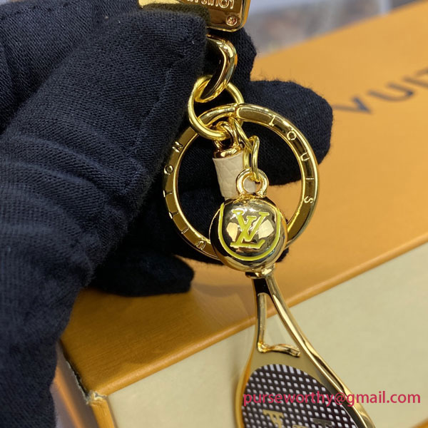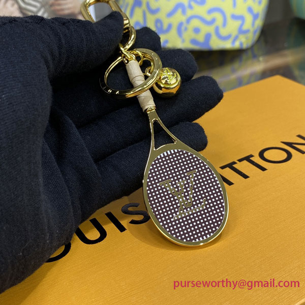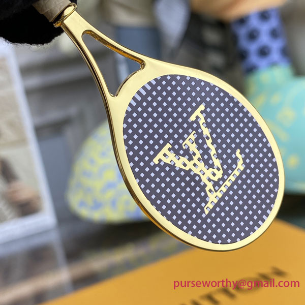 The LV Serve keyring is perfect for a tennis enthusiast. This sporty accessory features a racket made of shining hardware with a leather-wrapped handle, as well as a tennis ball engraved with the House's iconic Monogram pattern. It adds a playful touch to any sportswear look.