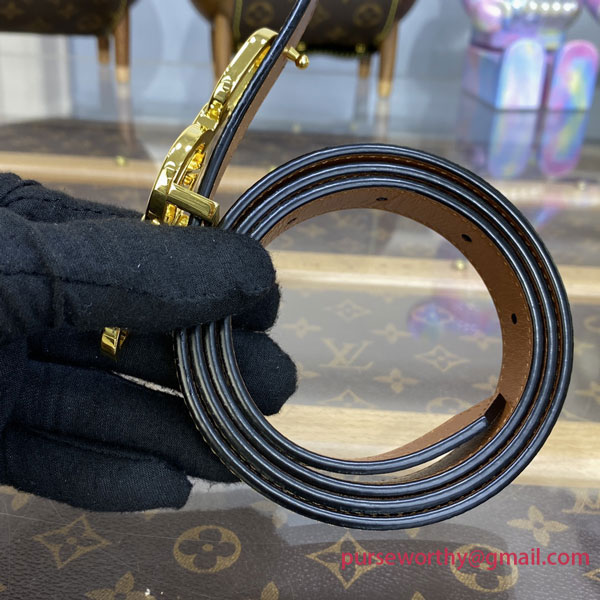 The LV Circle Prime 20mm reversible belt features a closure inspired by buckles from the House's shoe collectsion. This new signature hardware includes the LV Circle signature and interlocking chain links. The slim belt has both a leather and Monogram Reverse canvas side for added versatility.