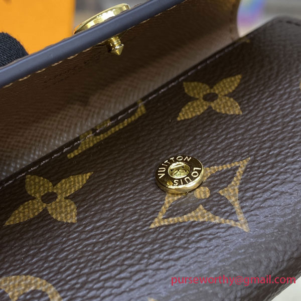 This compact case holds six keys on individual brass hooks. In Monogram canvas, it is a practical accessory for a handbag or briefcase.