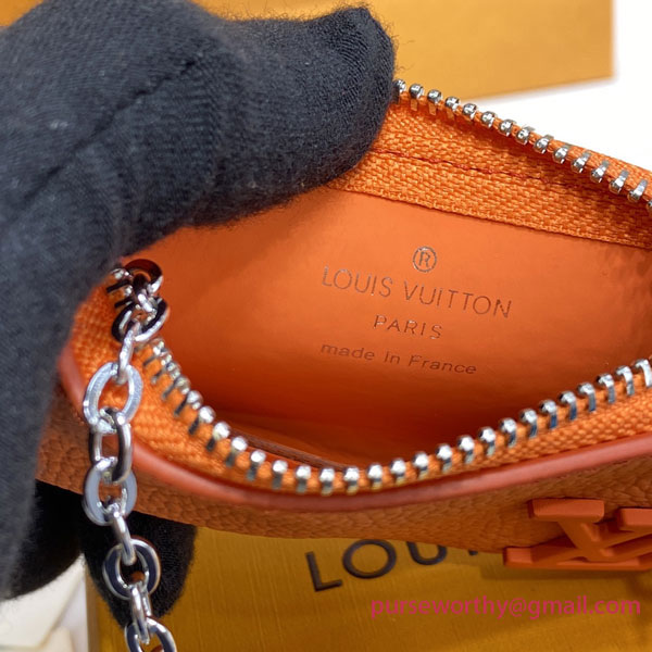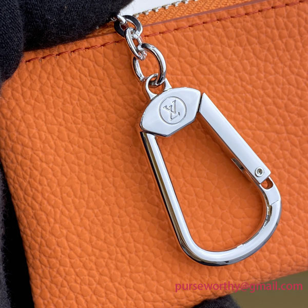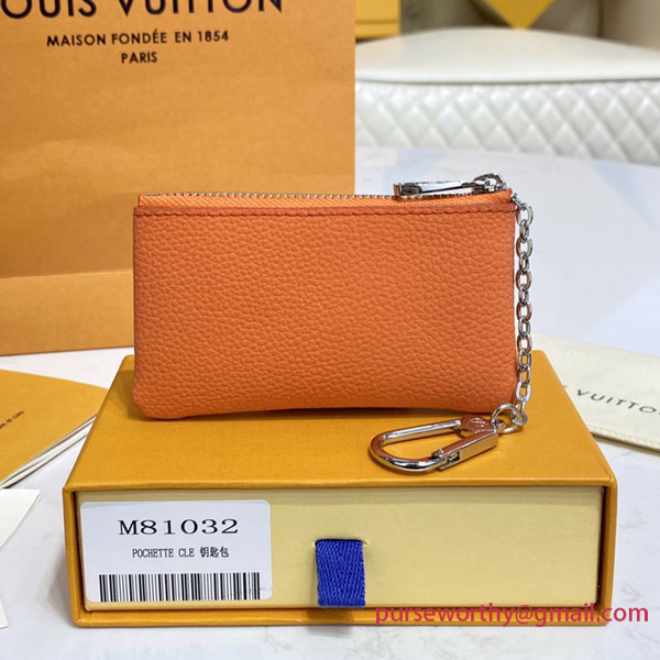 Louis Vuitton’s compact, practical Key Pouch now comes in an eye-grabbings shade of lustrous orange. Supple Aerogram leather is adorned with the “LV” monogram in tone-on-tone metal. Great for carrying coins and cards as well as keys, it features a chain and hook to clip it onto a larger bag for a splash of color.