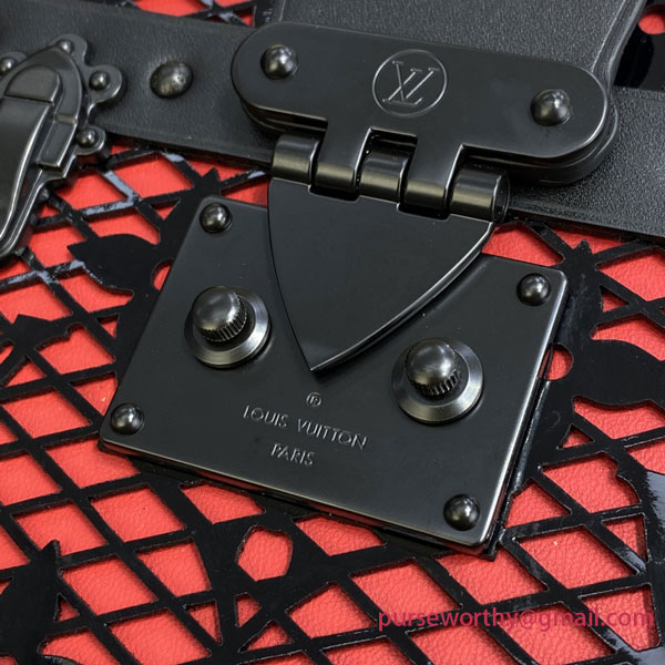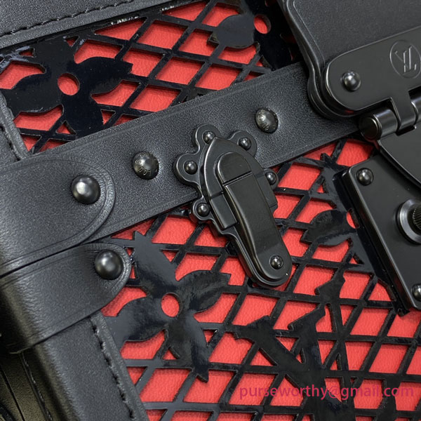 At first glance this Petite Malle handbag seems to be made from openwork lace but on closer inspection it reveals itself to be patent calfskin with a perforated Monogram pattern.