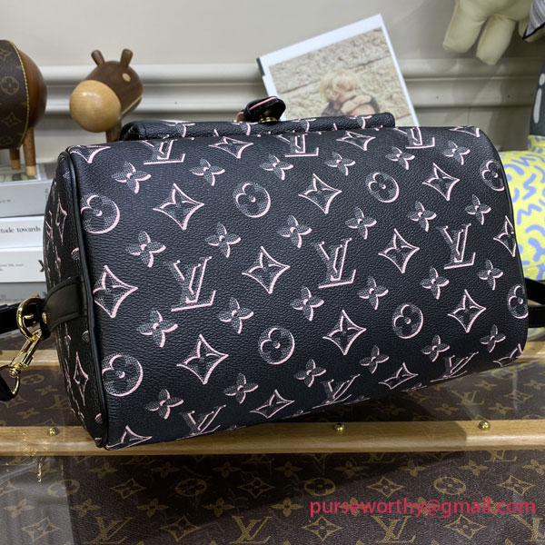 The compact Speedy Bandoulière 25 handbag reinvents its elegant silhouette with an outside pocket and gold-color buckle. The miniature Monogram pattern on the canvas and the leather trim evoke the House’s historic design codes, as do the rolled-leather handles and engraved padlock. An adjustable and removable strap enables shoulder and cross-body carry.