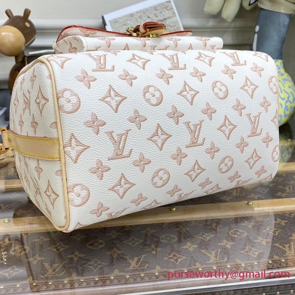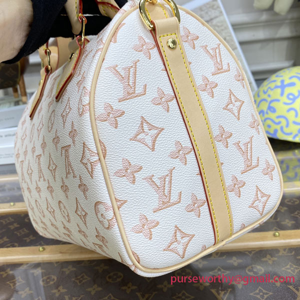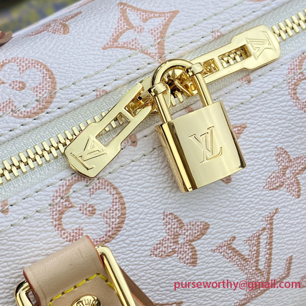 The compact Speedy Bandoulière 25 handbag reinvents its elegant silhouette with an outside pocket and gold-color buckle. The miniature Monogram pattern on the canvas and the leather trim evoke the House’s historic design codes, as do the rolled-leather handles and engraved padlock. An adjustable and removable strap enables shoulder and cross-body carry.