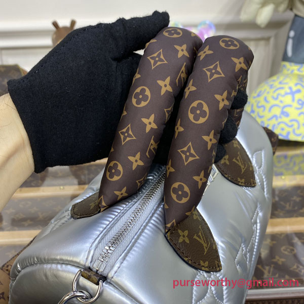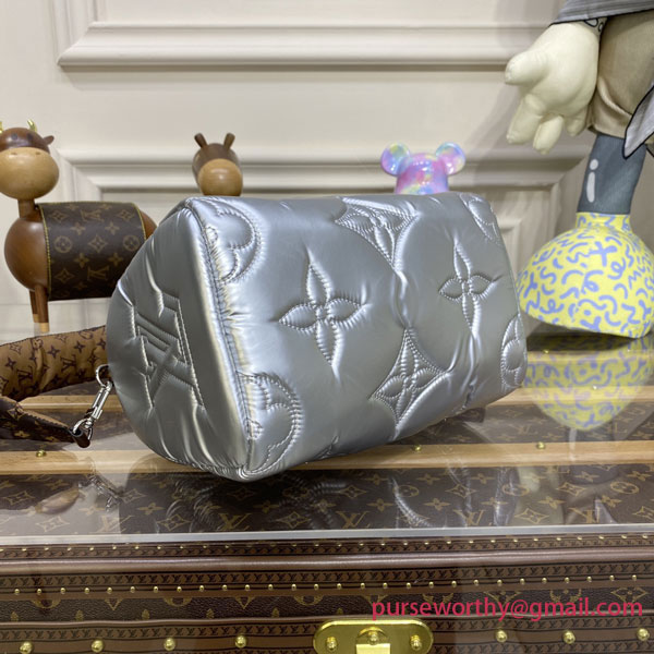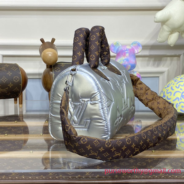 The LV Pillow Speedy Bandoulière 25 handbag brings a cool new attitude to one of the Maison’s most iconic designs. Made from padded recycled nylon in shimmery silver, the bag is embroidered with Monogram motifs and trimmed with mini Monogram canvas. The top handles and strap are padded too for a cozy, pillowy effect.