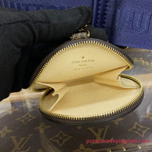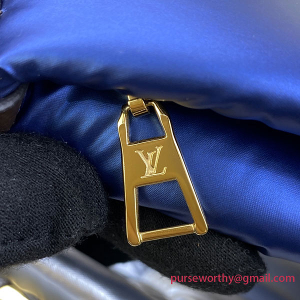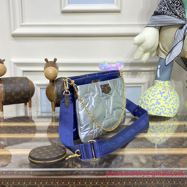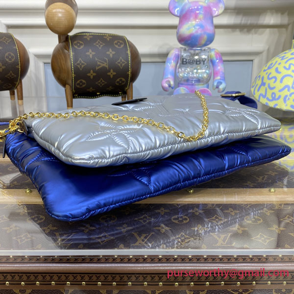 Crafted from recycled nylon in navy-blue and silver, the Maxi Multi-Pochette Accessoires belongs to the season’s LV Pillow capsule. This playful piece provides so many styling opportunities: it can be worn cross-body on the long removable strap, carried as a clutch or by hand on its removable chain, with or without the cute detachable coin purse.