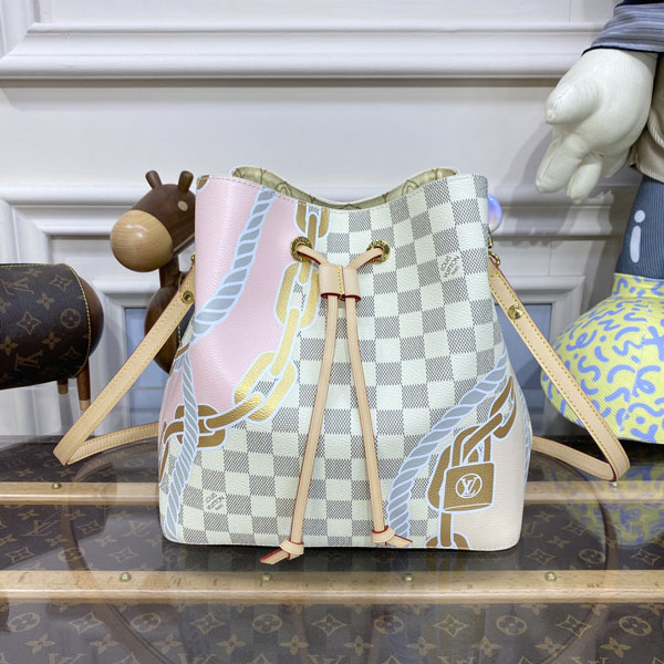 The body-friendly NéoNoé MM bucket bag takes on a summery feel in Damier Azur canvas, livened up with a bold yet feminine nautical print of ropes and chains. The bag’s strap can be adjusted for long- and short-shoulder carry as well as cross-body wear. The inside zipped pocket keeps belongings secure.