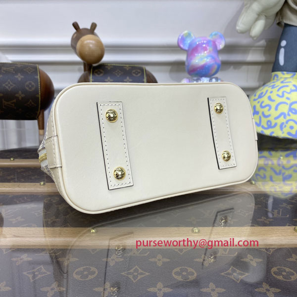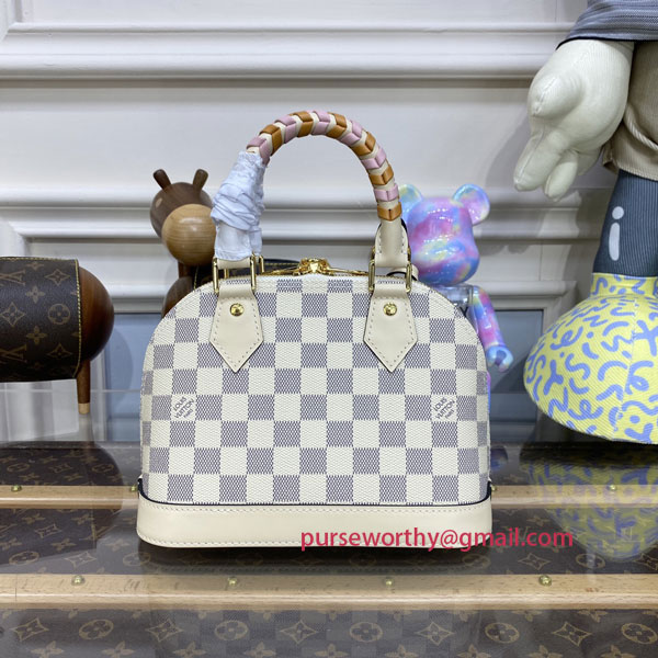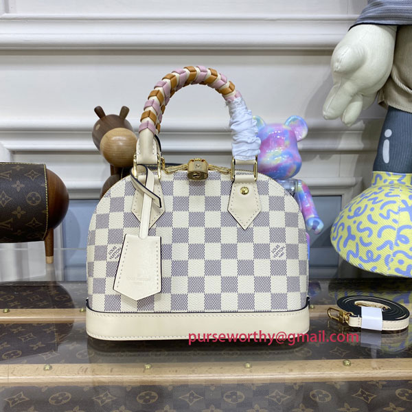 The Alma BB handbag welcomes Spring 2022 in a charming edition made from Damier Azur coated canvas, with leather trim in delicate shades of pink and cream. Two braided Toron top handles lend this model a crafted, feminine allure. The detachable long leather strap provides extra versatility, for over-the-shoulder or cross-body wear.