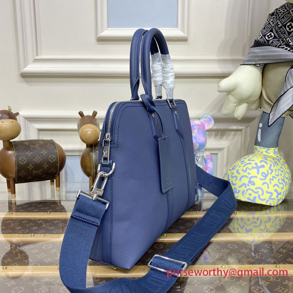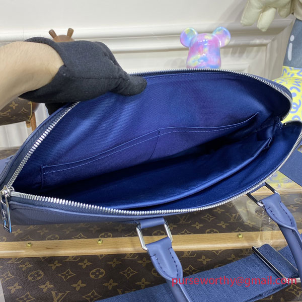 An elegant contemporary alternative to a traditional attaché case, this briefcase is styled in LV Aerogram leather dyed a rich shade of navy blue. Outside, it’s replete with discreet signature touches, from the metal “LV” monogram to the signed Jacquard strap. Inside, its ingenious design keeps everything neatly in place, and even has a special padded laptop compartment.