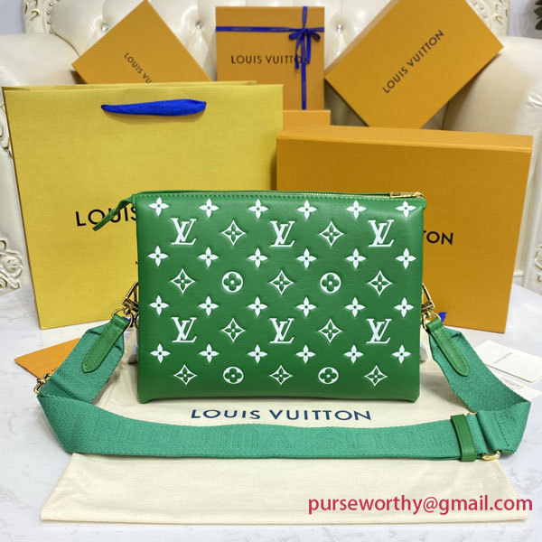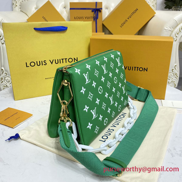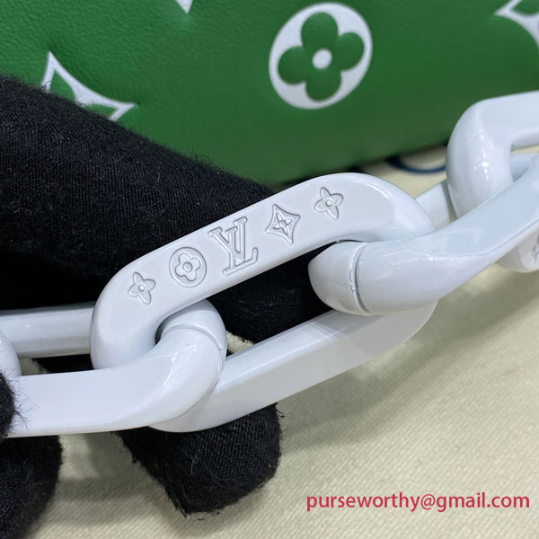 Evocative of the world of tennis, this brightly colored Coussin PM handbag is made from Monogram-embossed puffy lambskin with a chunky chain in contrasting white acetate, like the white lines on a tennis court. The chain enables shoulder carry while a wide shoulder strap allows shoulder and cross-body wear; both are detachable.