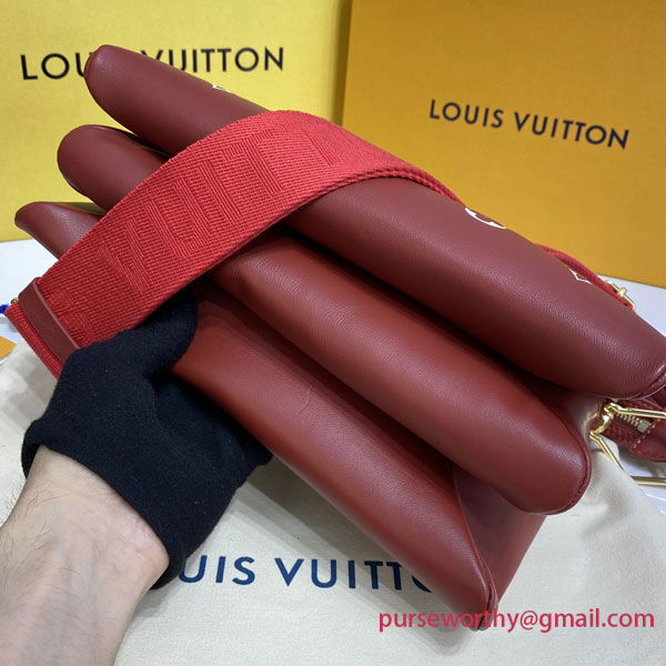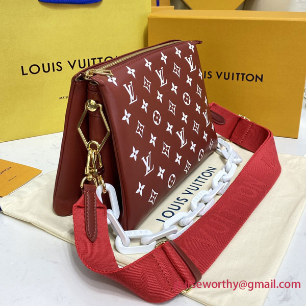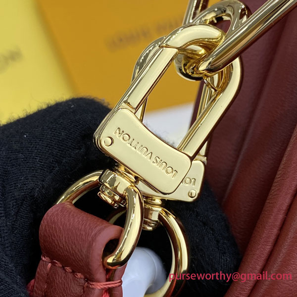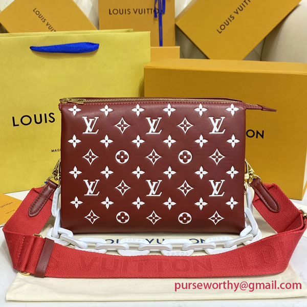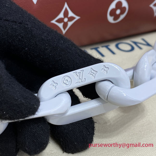 Evocative of the world of tennis, this brightly colored Coussin PM handbag is made from Monogram-embossed puffy lambskin with a chunky chain in contrasting white acetate, like the white lines on a tennis court. The chain enables shoulder carry while a wide shoulder strap allows shoulder and cross-body wear; both are detachable.