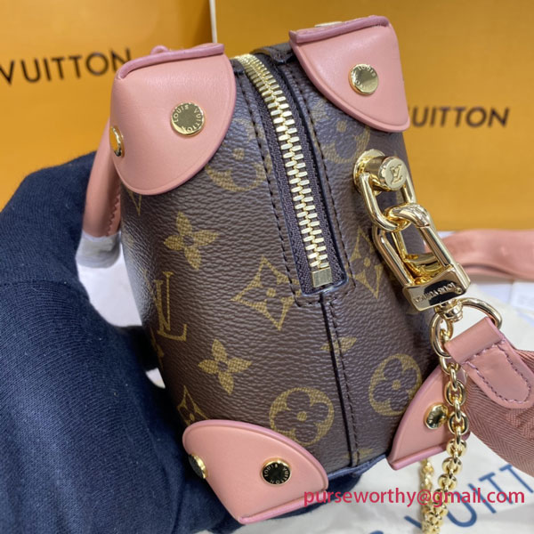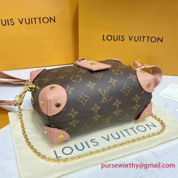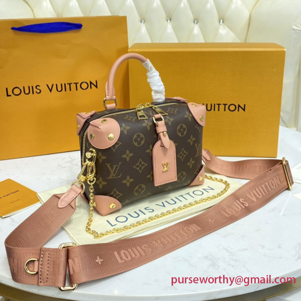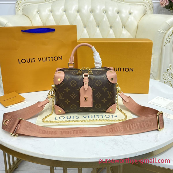 The distinctive Petite Malle Souple is a soft handbag steeped in the House history. The Monogram canvas, riveted leather corners, and leather name tag all evoke Louis Vuitton’s legacy as a trunk maker. A gold-color nautical chain and wide removable strap, with Louis Vuitton Malletier embroidered on it, bring up-to-the-minute style.