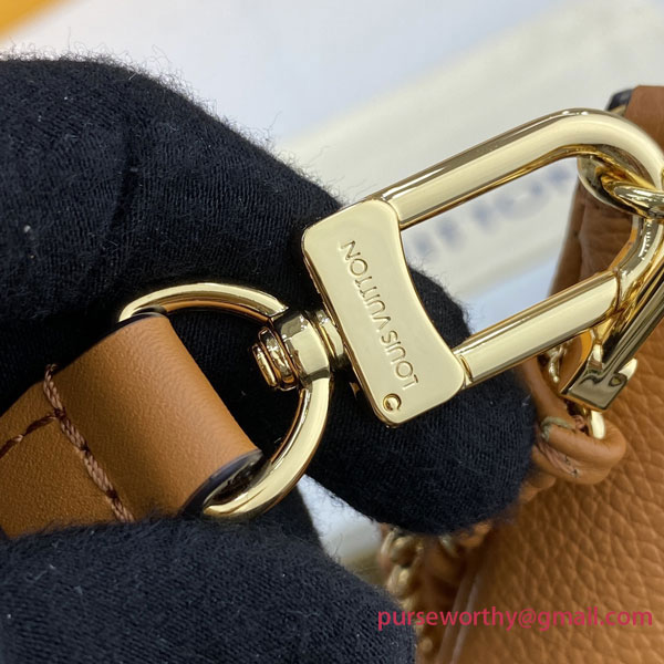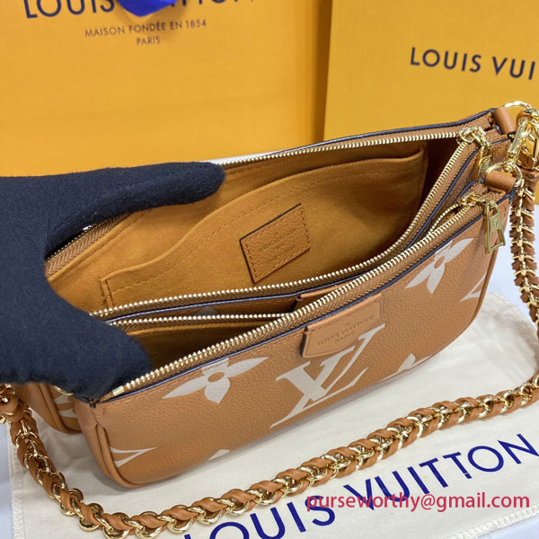 The Multi Pochette Accessoires cross-body bag is fashioned from Monogram Empreinte leather with a warm bicolor colorway that brings out the Monogram Flowers and LV Initials embossed and printed on the cowhide. This hybrid bag combines a Pochette Accessoires with a removable Mini Pochette Accessoires. There’s a detachable gold-color chain with leather braiding and a removeable shoulder strap.