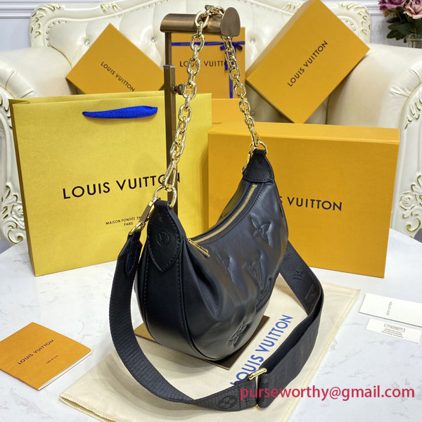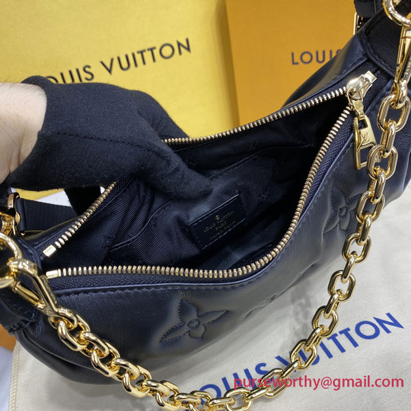 The Over The Moon delights with its versatile shape in quilted calf leather. The embroidered puffy Monogram pattern brings a statutory feel while the adjustable strap and gold-color chain deliver a myriad of carry options: elbow, short shoulder, cross-body, and long shoulder. With the strap removed, it can even be carried as an evening clutch.