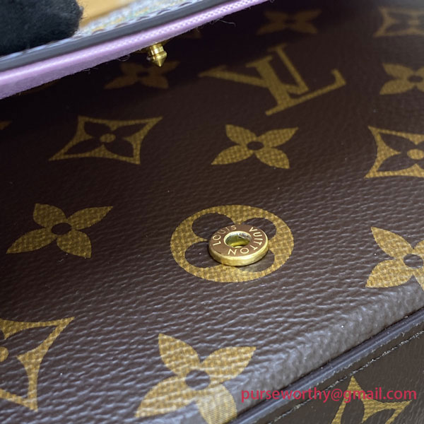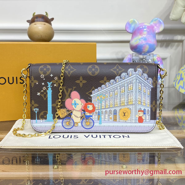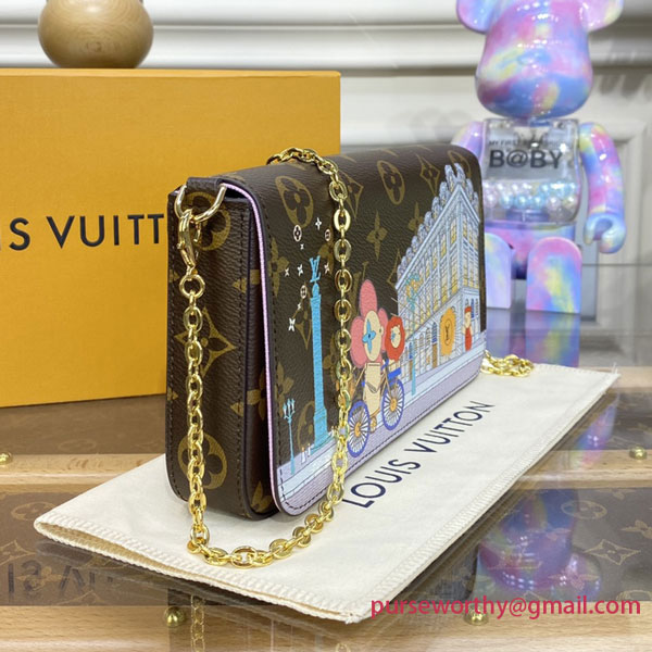 The Félicie Pochette in Monogram canvas is revisited for the Vivienne Holidays 2022 collectsion, which celebrates the spirit of travel. An exclusive print shows Louis Vuitton's Vivienne mascot in front of the Paris boutique, with the famous Place Vendôme column in the background. An ideal gift, this versatile, collectsible pouch is complemented by a pink textile lining.