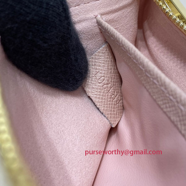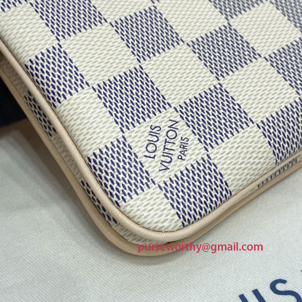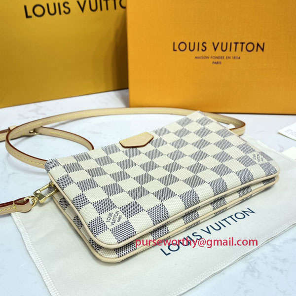 This summery version of the Double Zip Pochette comes in Damier Azur canvas with a removable strap in Louis Vuitton's emblematic natural cowhide leather. This versatile pouch features two secure zipped pockets with an open pocket in between. It is finished with a natural leather label embossed with the House signature.