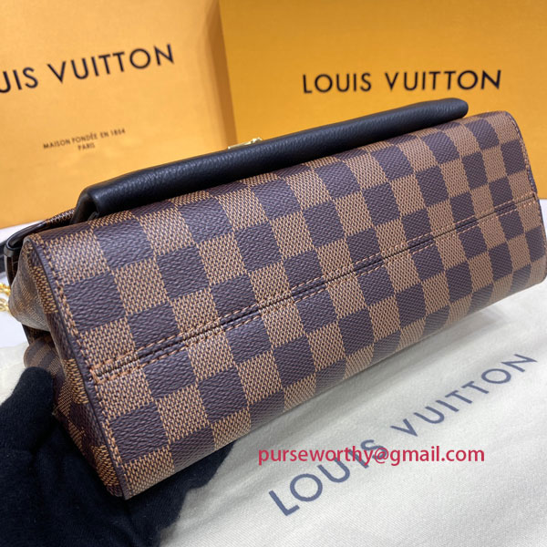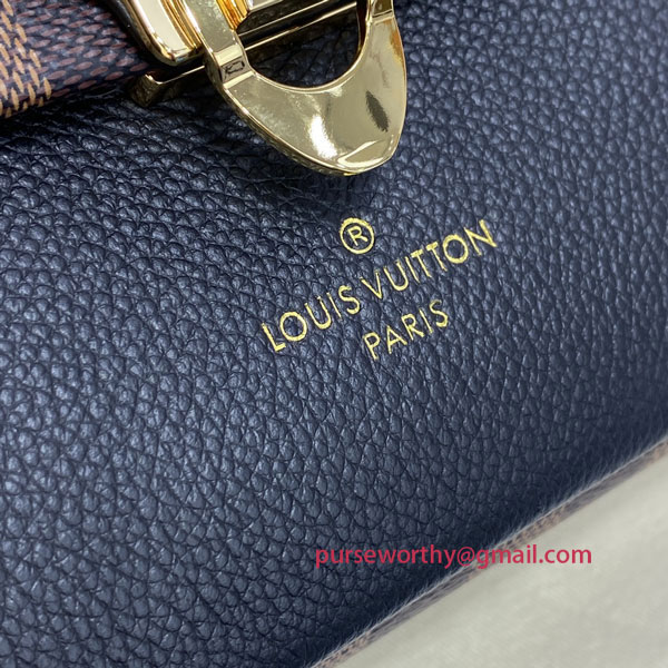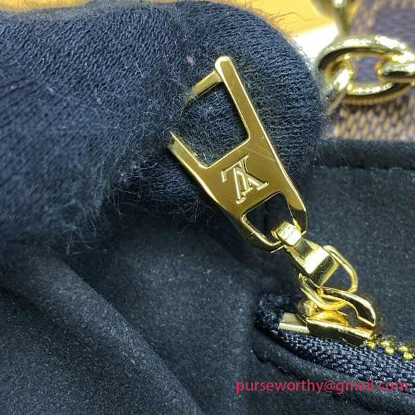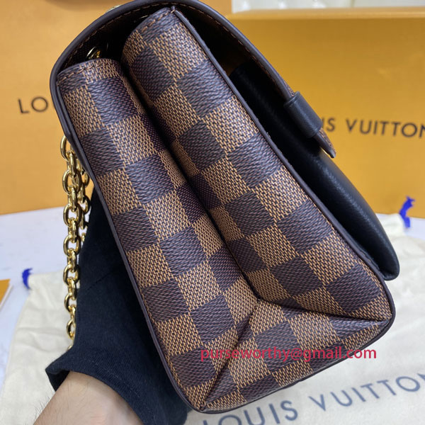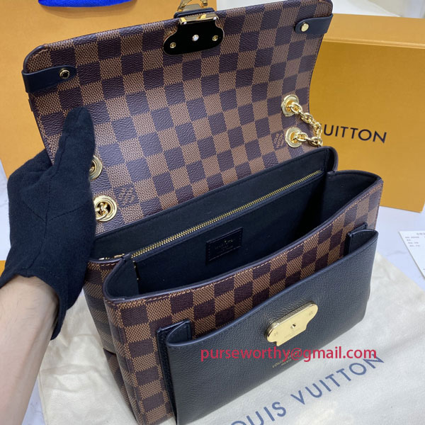 The Vavin chain bag is made from Damier Ebene canvas, elegantly balanced with soft calf leather. The golden-finish lock is inspired by those found on classic Louis Vuitton trunks. Light and body-friendly, the Vavin PM is suspended from a sliding chain handle fitted with twin leather shoulder pads, for a comfortable carry from day into evening.