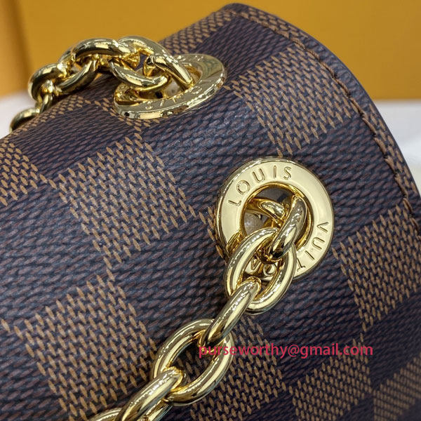 The Vavin chain bag is made from Damier Ebene canvas, elegantly balanced with soft calf leather. The golden-finish lock is inspired by those found on classic Louis Vuitton trunks. Light and body-friendly, the Vavin PM is suspended from a sliding chain handle fitted with twin leather shoulder pads, for a comfortable carry from day into evening.