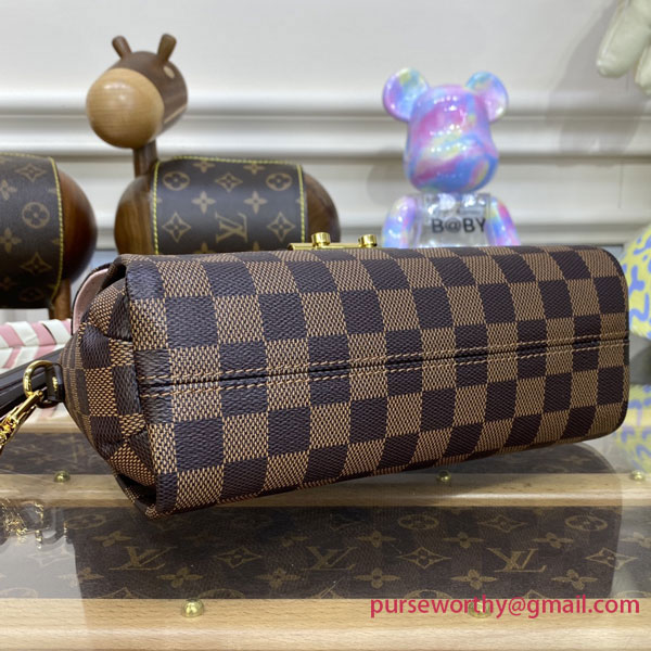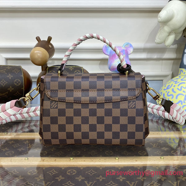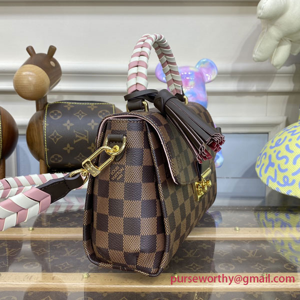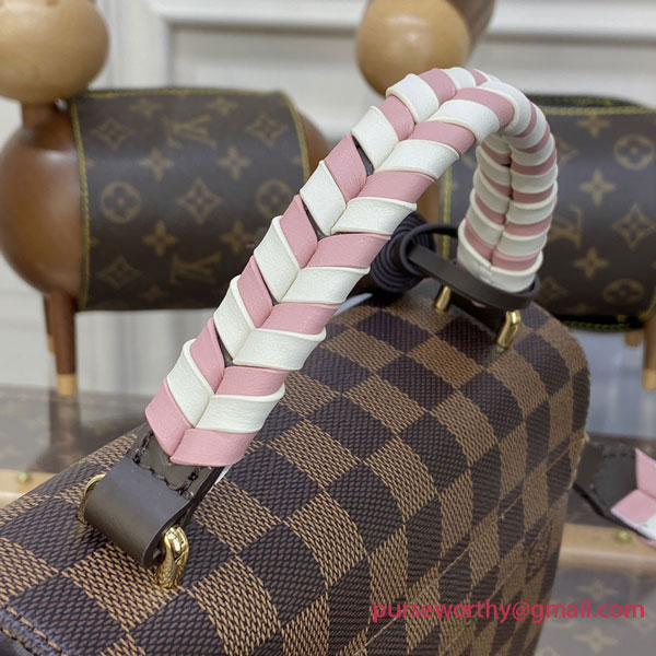This season’s edition of the Croisette handbag, fashioned from the Maison’s hallmark Damier Ebene canvas, features a beautifully braided handle and strap. The color play of woven cream and pink leather complements the classic checkerboard pattern, designed in 1888 by Georges Vuitton. A polished gold-tone S-lock lock and flirty leather tassel finish off the piece in signature style.