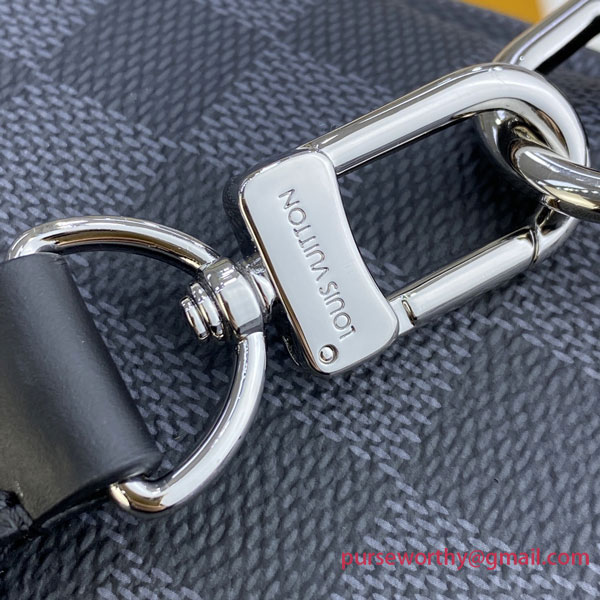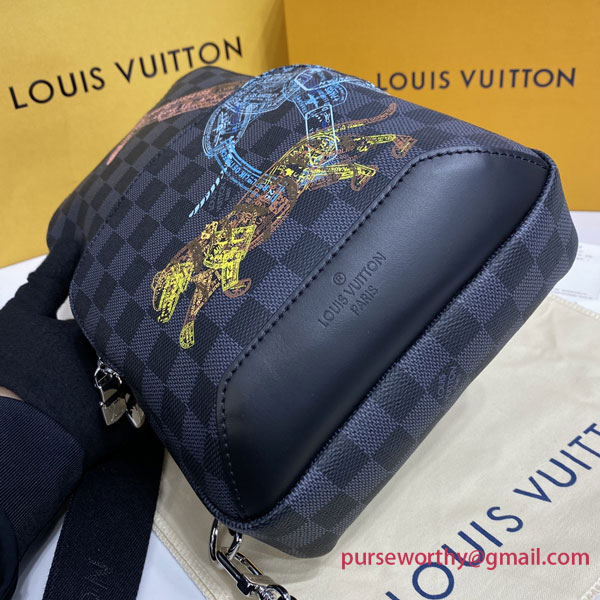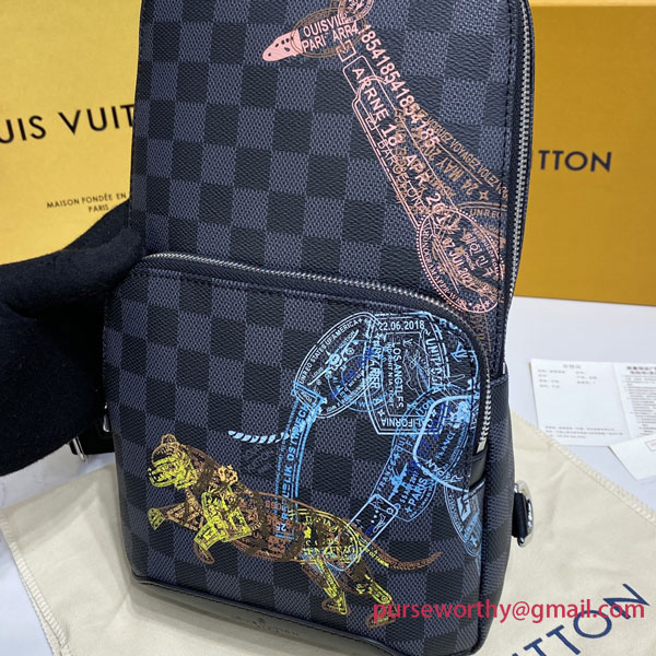 The Avenue Sling Bag, perfect for carrying everyday essentials, is made from Damier Graphite canvas with black-leather trim. The dark checkerboard pattern of the canvas is livened up with a pastel print of charging wild animals created from passport stamps. The Avenue’s strap adjusts for left- or right-side wear.