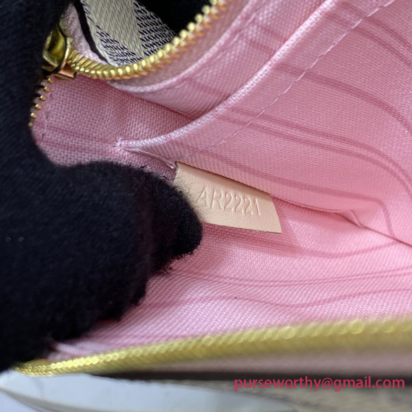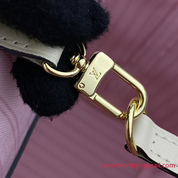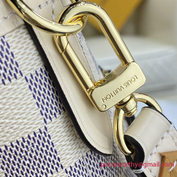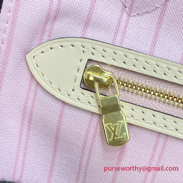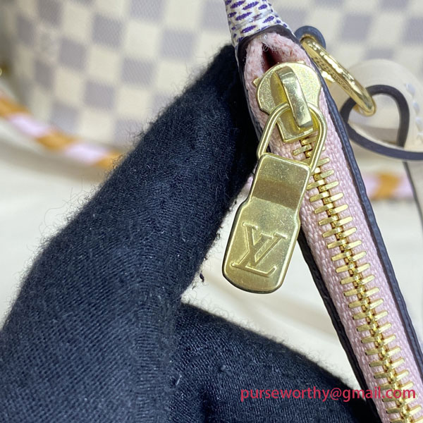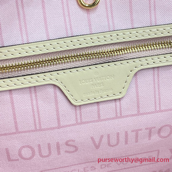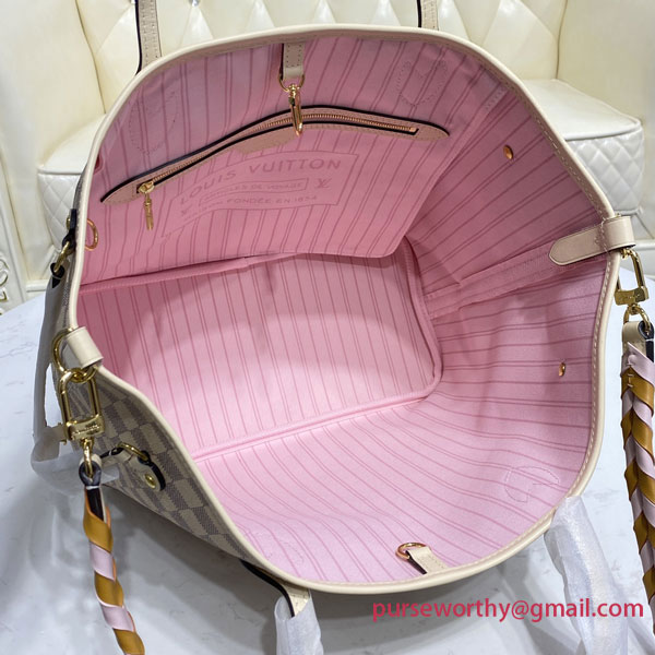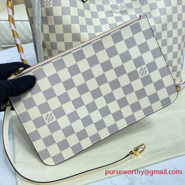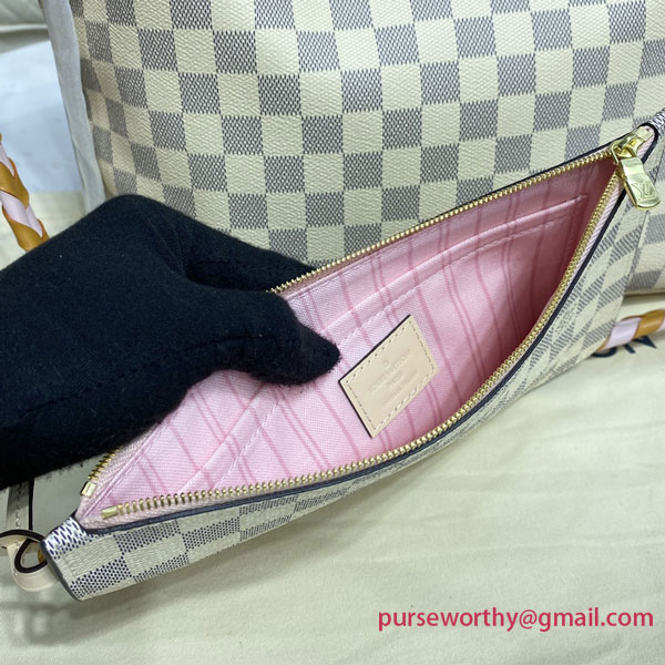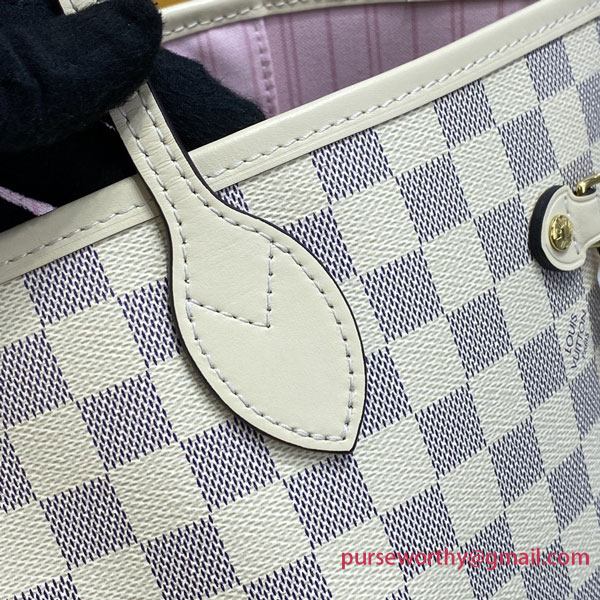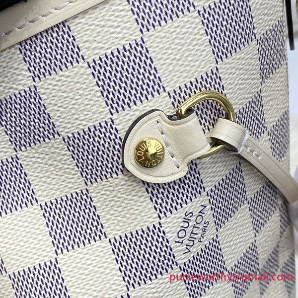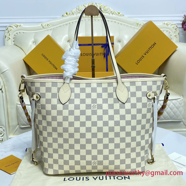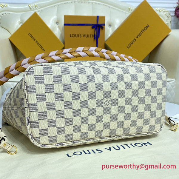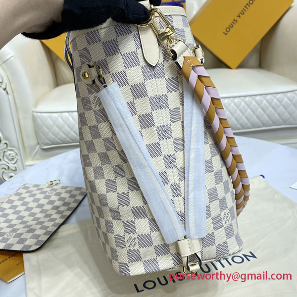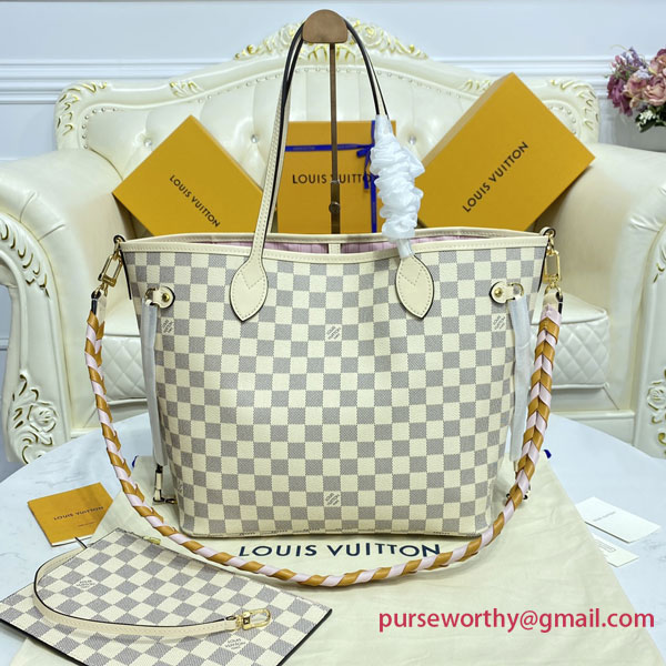 This Neverfull MM tote is fashioned from Damier Azur canvas with a strap in two tones of hand-braided leather. Inside, there's a removable pouch in matching checkerboard canvas. The bag's side laces can be cinched to keep what's inside safe and sound. Slim handles slip easily over the shoulder or arm.