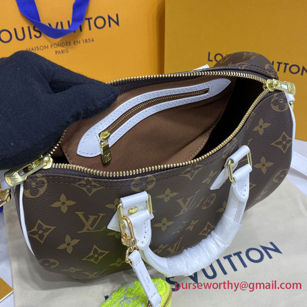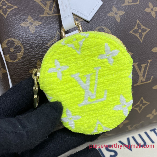 Classic Monogram canvas is combined with white-leather trim on this sporty Speedy Bandoulière 25 handbag. Finished with a Round Zippy Coin Purse colored like a tennis ball, this Speedy is Nicolas Ghesquière’s nod to the world of tennis. The top handles and detachable shoulder strap enable different carry options.