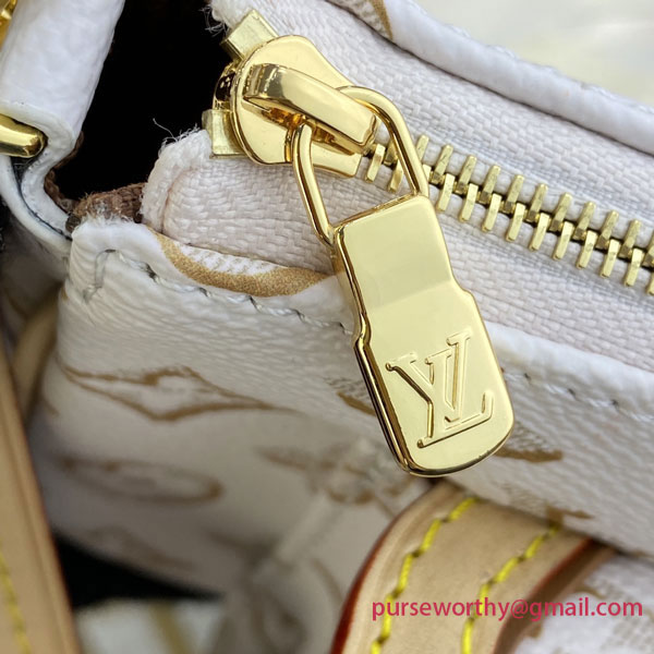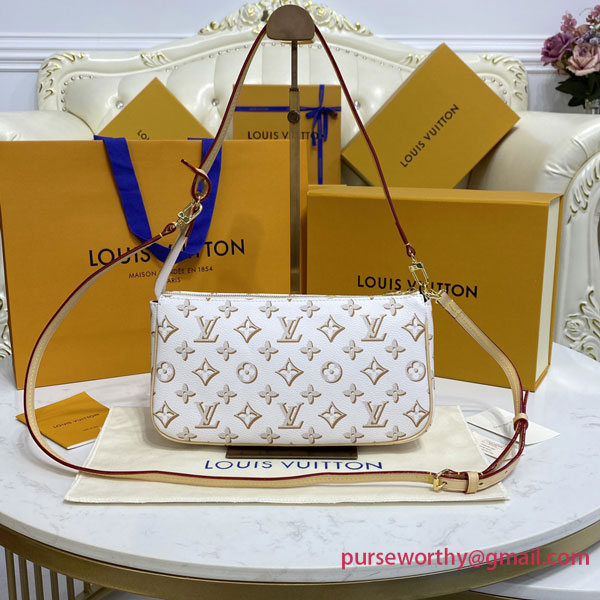 Featuring a gold-color buckle on its front pocket, the Maxi Pochette Accessoires handbag is made from colored Monogram canvas. Gorgeous details such as white borders on the pocket flap and strap and the shaded miniature Monogram pattern bring the House’s iconic style. The perfect micro bag, it enables elbow carry or sporty-chic cross-body wear.