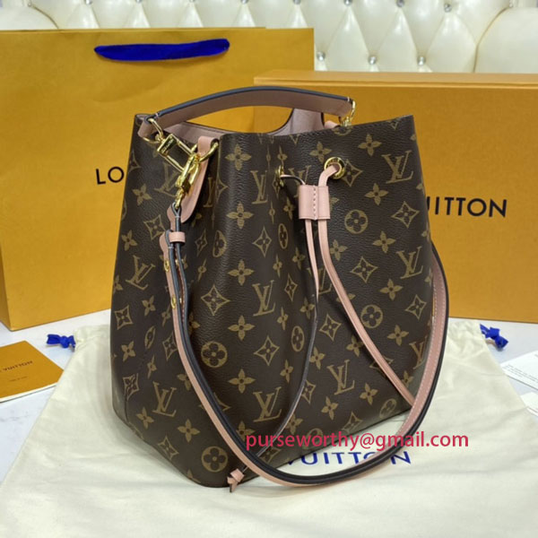 A true House icon, the NéoNoé bucket bag revisits a 1932 design by Gaston-Louis Vuitton. The original was created to transport bottles of Champagne in style; this modern version in Monogram canvas features a sleek shape, colorful leather trim and a matching bonded lining. The adjustable smart strap can be slung over the shoulder or lengthened for a trendy cross-body carry.
