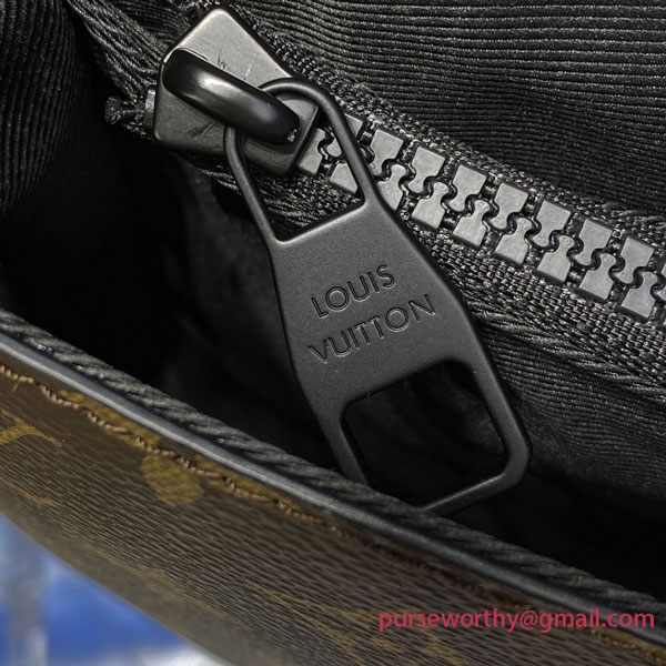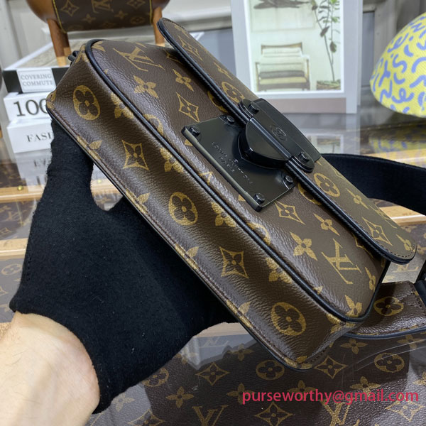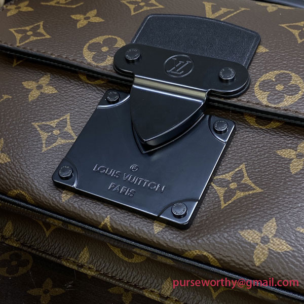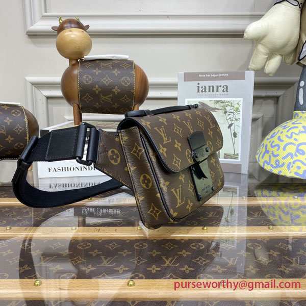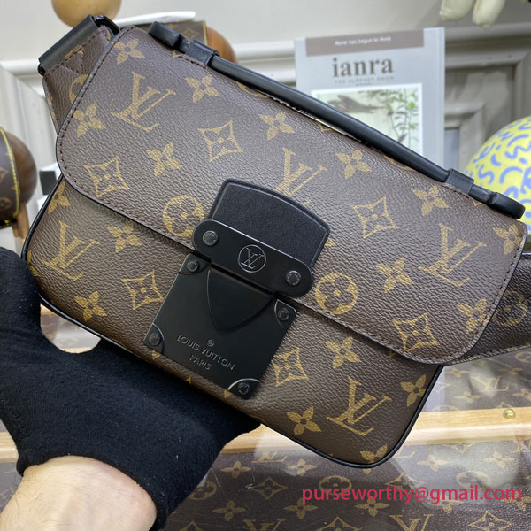 The new S Lock Sling Bag keeps personal items secure with a magnetic closure inspired by Louis Vuitton’s historic trunk clasps. Monogram Macassar canvas is accented by an innovative metal lock with an elegant matte black finish. A sturdy trunk-style leather handle and an adjustable strap, both adorned with the LV signature, offer multiple carry options.