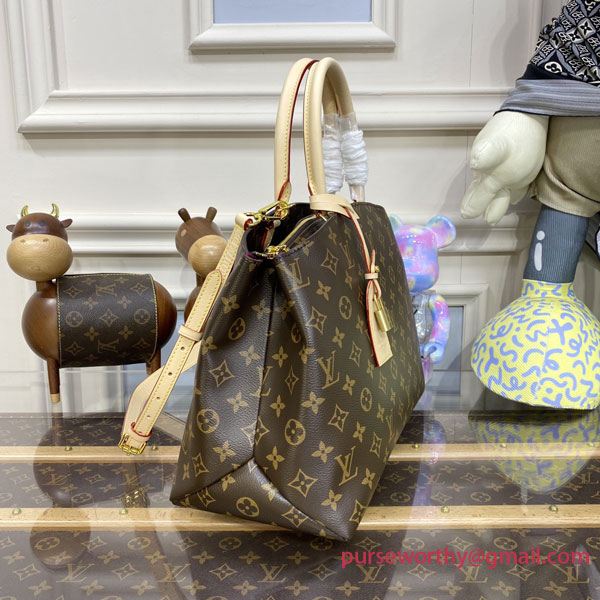Inspired by the iconic Lockit from 2011 and the shape of the Montaigne launched in 2014, the new Grand Palais tote is as versatile as it is feminine. Made from Monogram canvas with natural-leather trim, its interior features a vivid red lining and a Louis Vuitton patch. The removable strap and top handles give carry options.