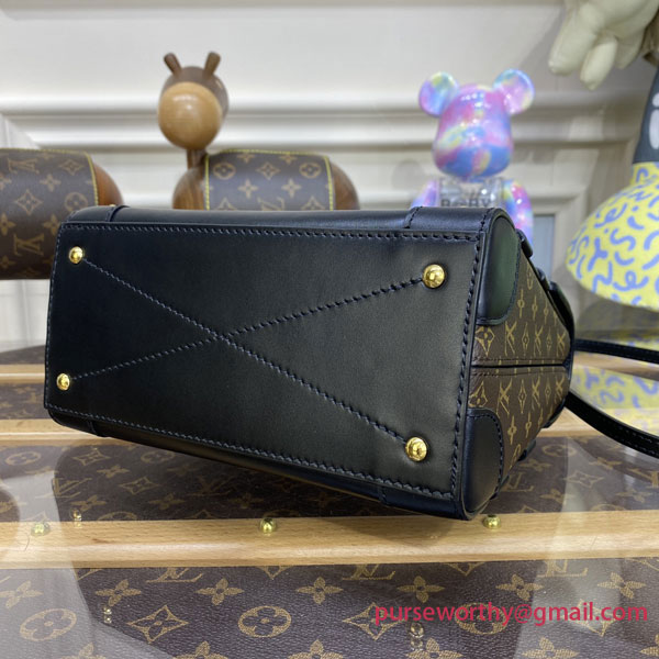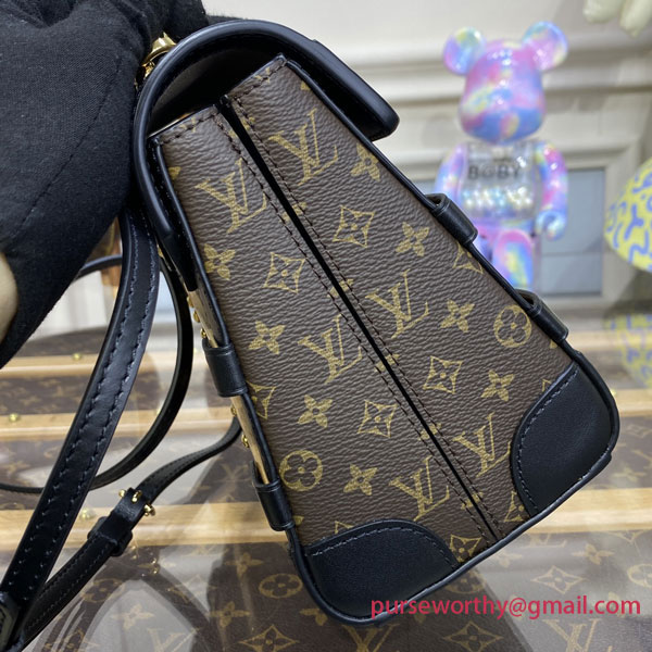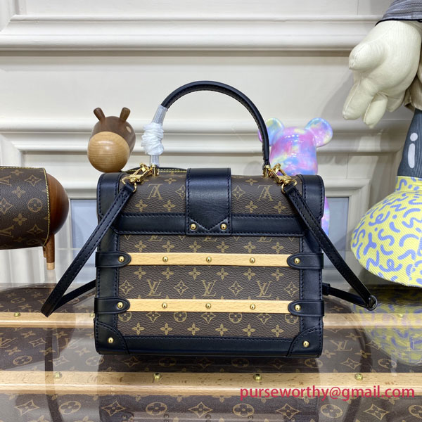 Inspired by the House’s trunkmaking legacy, Nicolas Ghesquière has created the adorable Trianon PM handbag in Monogram canvas. It’s semi-rigid construction, S-lock, and wooden and leather trim clearly evoke Louis Vuitton’s historic trunks. It has a single top handle for hand carry as well as a removable, adjustable leather strap for shoulder or cross-body carry.