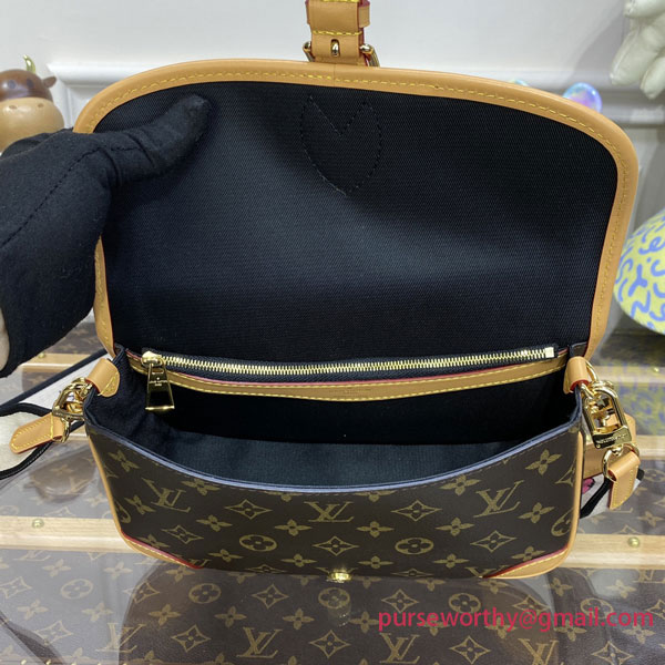 The Diane satchel in Monogram canvas revisits a classic model from the 90s, combining such vintage details as leather corners and an archival-inspired buckle with the modern functionality of smart pockets and a well-organized interior. The exclusive wide jacquard strap reverses from a bold Louis Vuitton signature to a subtle Monogram Flower motif.