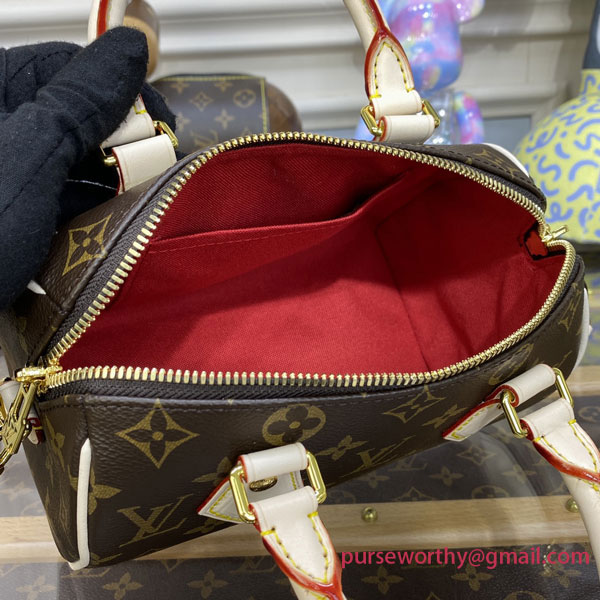Like a diminutive version of the House’s historic Speedy travel bag, the Speedy Bandoulière 20 handbag is crafted from Monogram canvas with natural cowhide trim. In addition to the rolled leather top handles, there’s a wide detachable and adjustable textile strap with a woven Louis Vuitton signature. This bag’s classic design is completed with red textile lining.