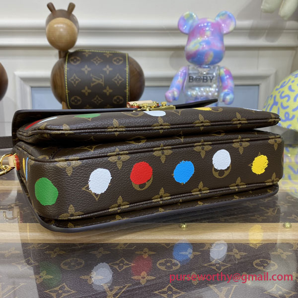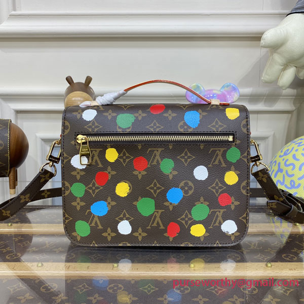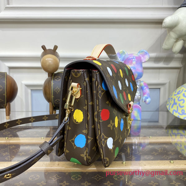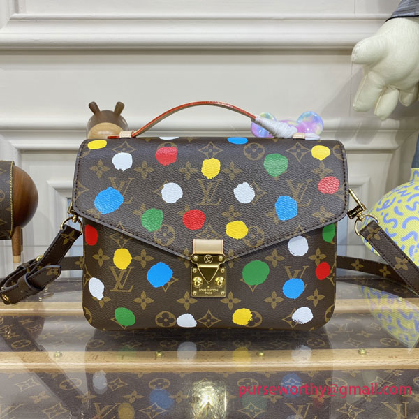 Part of the exclusive new Louis Vuitton x Yayoi Kusama collectsion, the LVxYK Pochette Métis is an upbeat variation on a classic bag. Monogram canvas is enlivened with one of the visionary Japanese artist’s signature themes: an array of brightly colored dots, applied with a complex screen-printing technique that gives them a realistic hand-painted effect. A distinctive, creative look for an elegant accessory.