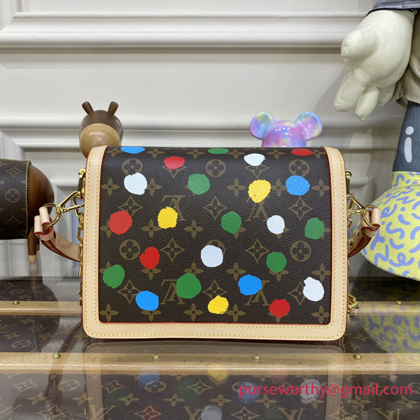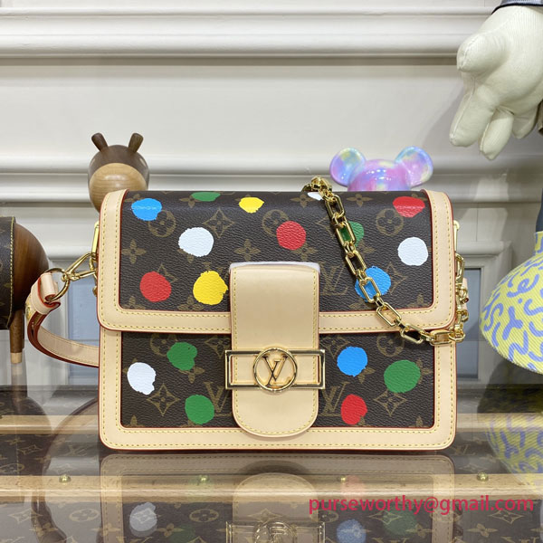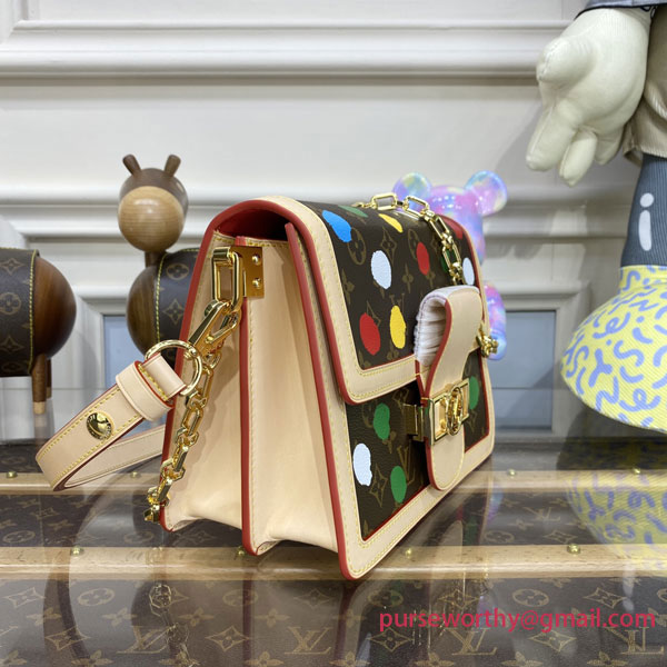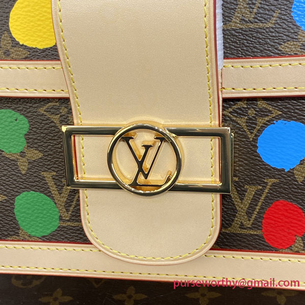 The LVxYK Dauphine MM joins the “Painted Dots” theme as part of the exclusive Louis Vuitton x Yayoi Kusama collectsion. The venerable Japanese artist is known for her use of dots, an emblematic motif for her since childhood. In this version of the Dauphine, rainbow-colored dots adorn Monogram canvas, screen-printed with a 3D hand-painted effect. A high-spirited new look that brings fresh creative energy to a classic bag.